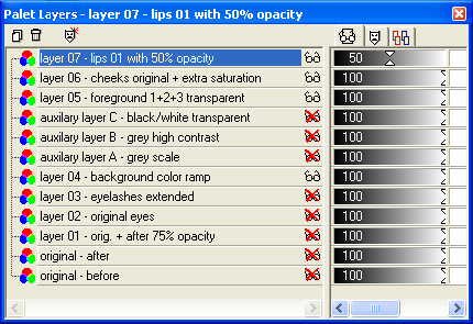 Was disappeared by making the cheeks, so adding again. Copy/pasted the lips part of layer 01, but with only 50% opacity: that will be enough.